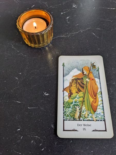 Der Eremit zeigt einen Mann der vor verschneiten Bergwipfeln steht. Er hält eine Laterne für die aufsteigenden Wanderer, steht aber weit über ihnen, als ob er ihnen den Weg erleuchten möchte. Er hat einen weißne Bart, der ihn als heiligster Ältester ausweist, der eins mit dem zranfänglichen Willen ist. Er trägt eine graue Mönchskutte, die ihrerseits auch eine Bedeutung hat. Sie steht für den „Verborgenen in allem Verborgenen“. Er ist Quelle und Ziel gleichermaßen. Jede spirituelle Praxis zielt darauf hinaus. Auf die Vereinigung des persönlichen Bewusstseins mit dem kosmischen Willen. Das was oben ist, entspricht dem was unten ist – das hermetische Axiom findet seine Entsprechung in dieser Karte.