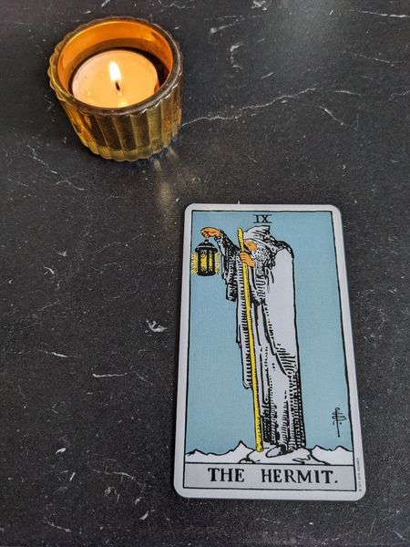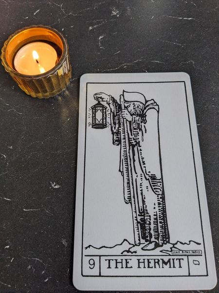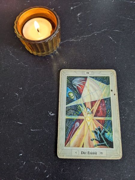 Der Eremit wird als Vollendung der Innenschau dargestellt. Er wird als weiser Mann, als Laternenträger und Führer dargestellt. Er beleuchtet Zerberus, den Wächter der Unterwelt. Er steht für die dunklen und unbekannten Bereiche unseres Innenlebens. Die Teile die erst erforscht und erfahren werden müssen, bevor sie wahr werden. Einer seiner drei Köpfe schaut zurück und stellt sicher, dass alles abgeschlossen ist, bevor etwas Neues beginnt. Er wacht darüber, dass wie unerledigtes aus der Vergangenheit abschliessen um offen für den Wandel/die Transformation zu sein.