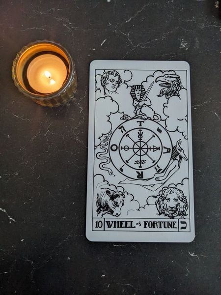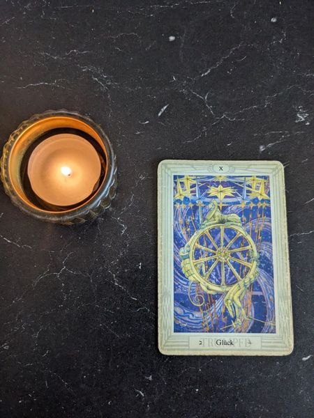 Auch bei Crowley steht die Karte Glück, das Glücksrad, an der Position 10 und entspricht dem universalen Prinzip des Überflusses, der Expansion und des Reichtums. Astrologisch ist sie ebenfalls dem Jupiter als Planet des Glücks zugewiesen und erinnert uns daran, dass wir wie Fortuna in der römischen Mythologie unserem Leben eine positivere Richtung geben können.