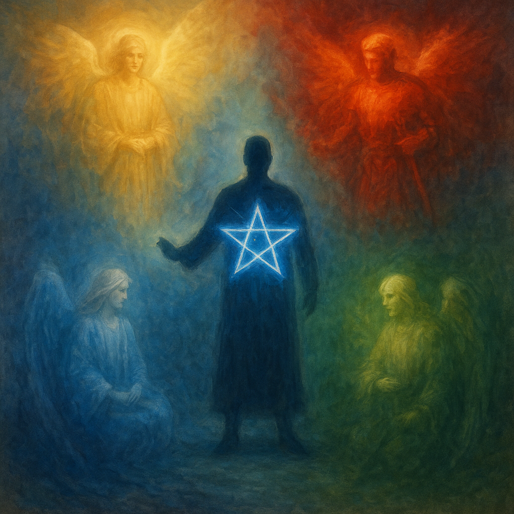 Nach dem Ziehen des Kreises und der Projektion der Pentagramme rufen wir die vier Erzengel an. Nicht als bloße mythologische Figuren, sondern als lebendige, archetypische Kräfte, die die vier Himmelsrichtungen, Elemente und Säulen deines magischen Tempels verkörpern. Diese Anrufung dient nicht nur dem Schutz, sie richtet dein ganzes Wesen in der Welt magisch, energetisch und symbolisch aus: Du stehst im Zentrum des Weltkreuzes. Die Engel bilden ein lebendiges Kraftfeld, das dich umgibt. Jeder trägt eine elementare Signatur, die mit deinem Inneren resoniert.