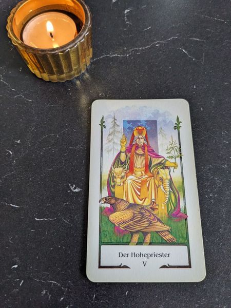 In seiner Hand hรคlt der Hohepriester den Stab der Hingabe – eine Erinnerung, dass Geist Herz und Handeln dieselbe Absicht und das selbe Ziel haben sollte. Sie mรผssen stรคndig zueinander ausgerichtet werden. Der Thron des Hohepriesters ist von Elefanten gesรคumt, die der Natur des Stiers entsprechen. Die Karten beinhaltet ein Hexa- und ein Pentagramm, die fรผr Makro- und Mikrokosmos stehen.