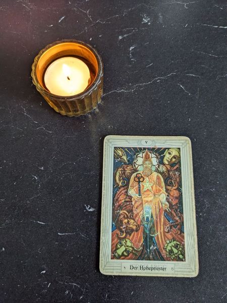 Der Hierophant sitzt auf einem Steinthron zwischen zwei Sรคulen. Der Hintergrund und der Thron sind grau, der Mischung aus schwarz und weiร. Es steht fรผr das Gleichgewicht der Gegensatzpaare. Die Ornamente auf den Sรคulen stellen phallische Symbole der Vereinigung dar. Die Sรคulen stehen auch fรผr die Dualitรคt aus Verbindung und Verknรผpfung. Oben an den Lehnen des Throns befinden sich Symbole des Stiers. Seine Krone ist ein dreifaches Tiara, die aus Gold besteht und Weisheit und strahlende Energie bedeutet. Sein Obergewand ist rotorange und damit dem Stier entsprechend. Als Besatz hat es eine blaugrรผne Borte die dem Skorpion zugeordnet ist (Komplementรคr zum Stier). Das Obergewand wird durch eine Nadel zusammengehalten, welche wie ein Halbmond aussieht. Unter seiner Robe trรคgt er ein blaues Gewand was an die Hohepriesterin erinnert. Und darunter ein weiรes, wie beim Narren. Seine Schuhe sind mit Kreuzen verziert die auf die Vereinigung mรคnnlich weiblich positiv negativ hinweisen. Die selben Kreuze trรคgt er auch auf seinem Handrรผcken, auf dem Teppich und auf den Griffen der gekreuzten Schlรผssel. In seiner linken Hand hรคlt er einen Stab der die Herrschaft und Lebenskraft symbolisiert. Es ist golden und steht fรผr die allumfassende ausstrahlende Macht steht. Das Zeichen seiner rechten Hand entspricht dem Zeichen der Geheimlehre die zwischen dem verhรผllten und dem in Erscheinung tretenden Teil unterscheidet.